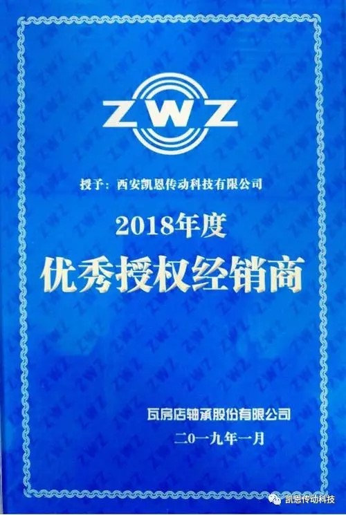 西安凱恩傳動科技有限公司以銷售高質量的產(chǎn)品、優(yōu)良的服務和及時的供貨能力而獲得業(yè)界的好評。2017年度被瓦房店軸承股份有限公司授予2017年度優(yōu)秀授權經(jīng)銷商稱號。